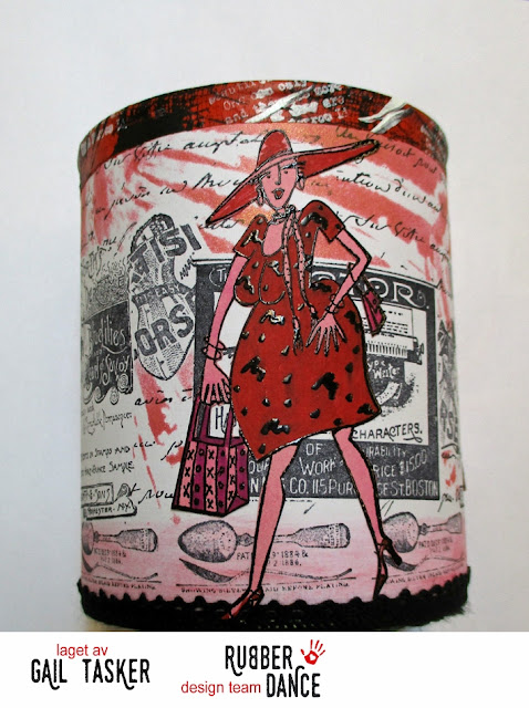 I stuck my tape around the top edge and added some black lace around the base of the tin. I stamped Rubber Dance The Shopper three times, coloured them, fussy cut and stuck them around the can.