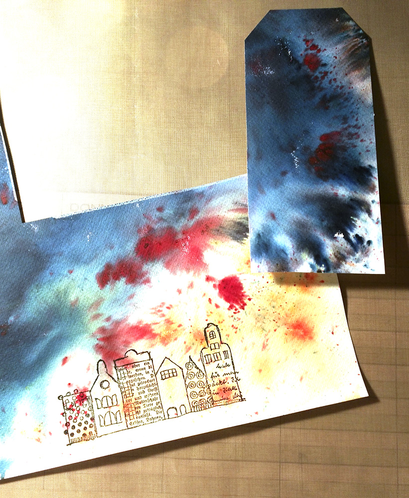 Finally I cut out the houses and adhered them on the bottom. I colored the windows and doors with Distress Markers (Walnut Stain, Mustard Seed).