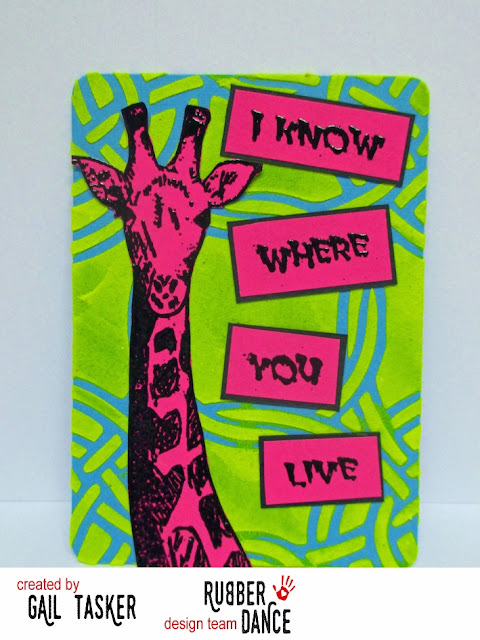 Hello. Gail from the design team here today with some inspiration for the current Rubber Dance colour challenge, Magenta, Yellow and Turquoise. I decided to use one of my favourite Rubber Dance stamps, Giraffe, and play with some words.