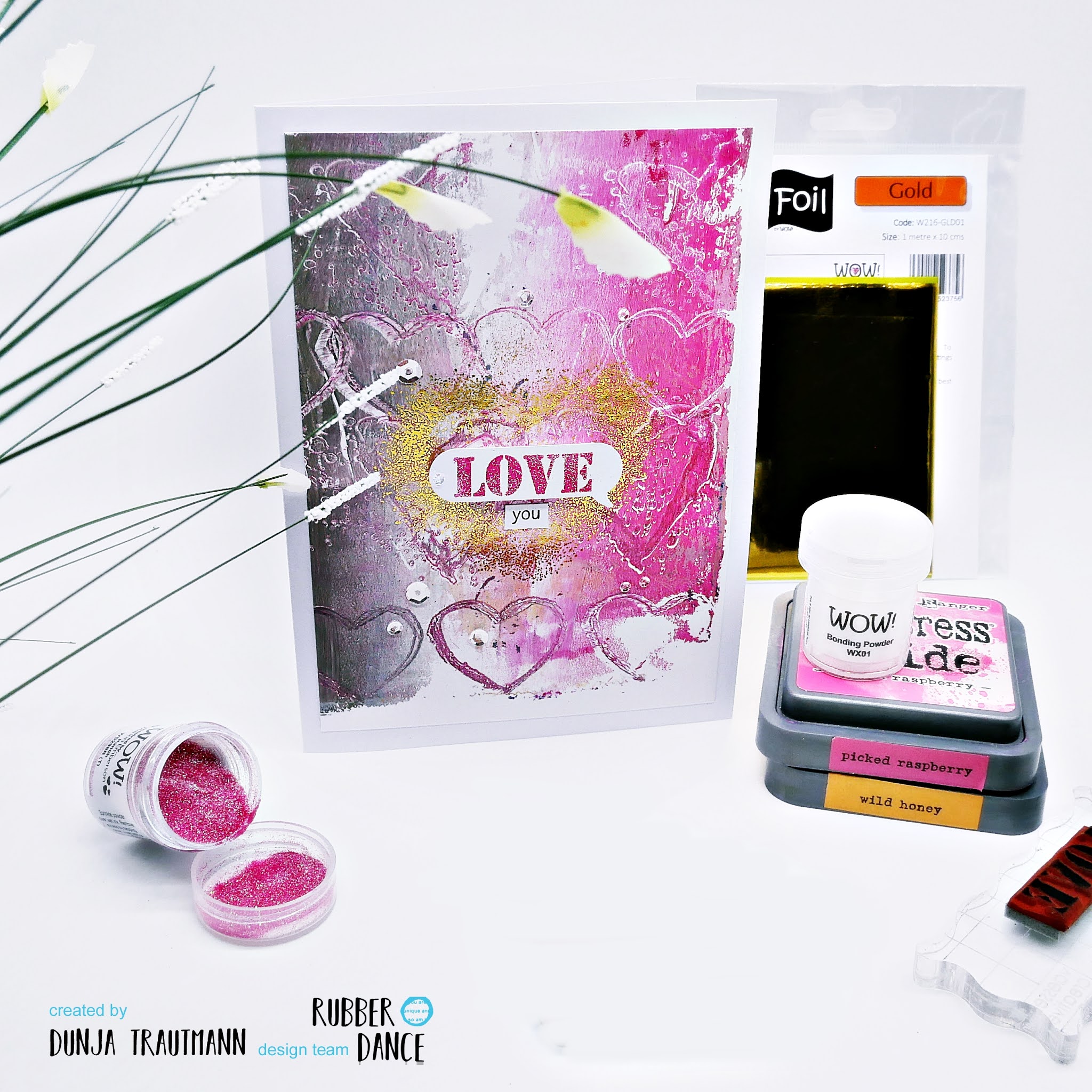 Once again i've used one of my gelprints and stamps from Rubber Dance, as well Embossing Powder and FabFoils from WOW! Embossing.