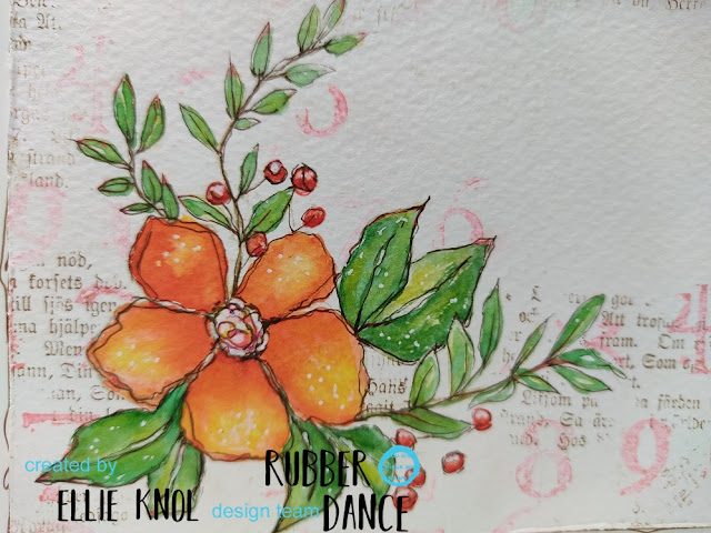 Ink the numbers from the Pick A Number stamp set with an orange ink, stamp it to a separate piece of paper first, then stamp it onto the background of the watercolored image; it's called second generation stamping.