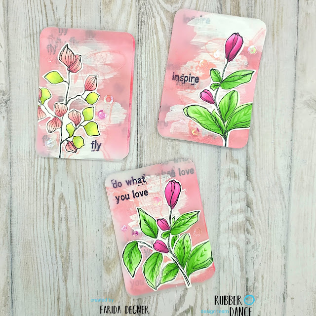 I took the stamped flowers and stamps and coloured them in with my favourite colour medium - the alcohol markers. Next I took a piece of paper, that already had some pink glitter water colouring on it and cut it down to three ATCs. The vellum pieces have some dry bushed white arcylic spots on it. And last but not least I took some sentiments and butterflies from the Grungy Butterfly sets.